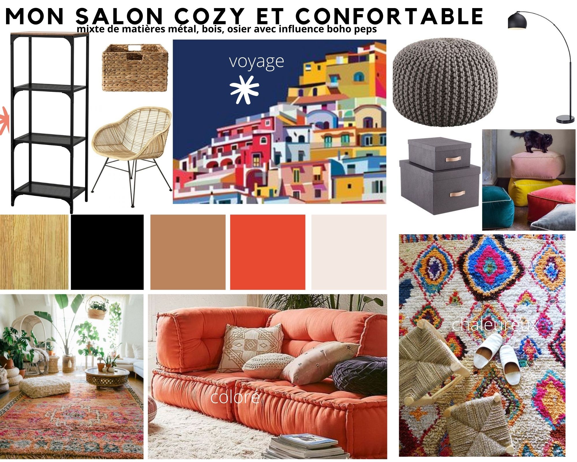 Planche d’inspiration et plan 3D pour trouver une solution adaptée aux problèmes des jouets qui ont envahit le salon et d’offrir une solution pour le télé travail en conservant les meubles le plus possible. le salon est agrandi par la fermeture de l’entrée par une verrière ou un claustra pour fermer en conservant la luminosité .