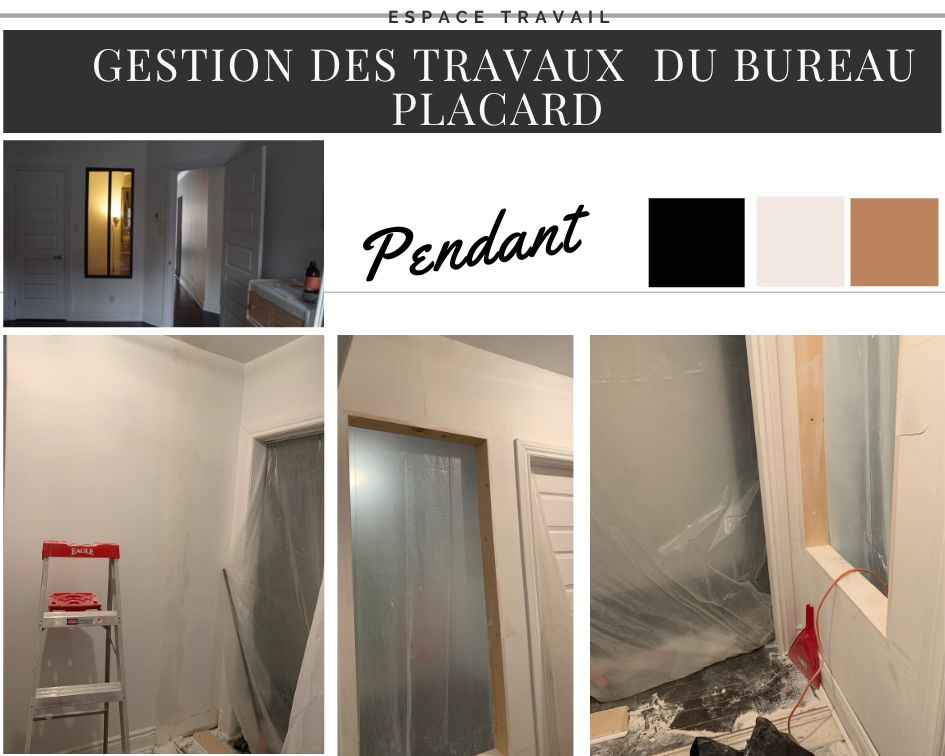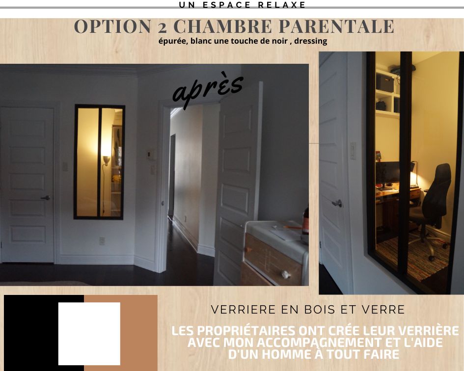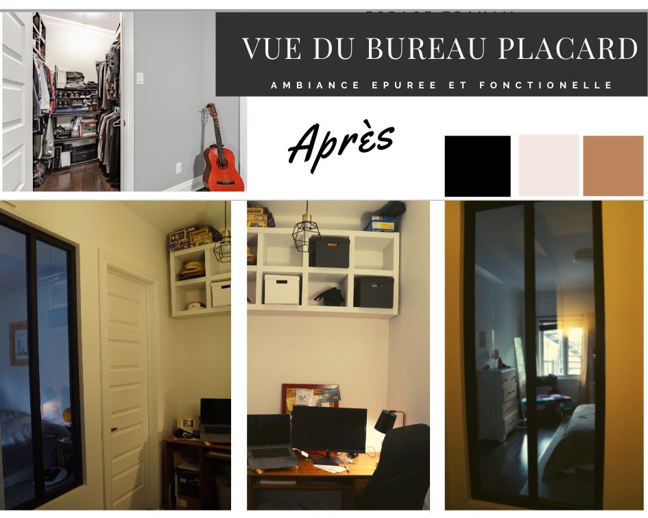 Voici un exemple de projet all in avec planches d’inspirations, plans en 2D,3D et un accompagnement lors de réalisation des travaux. La mission était d’adapter un condo avec deux espace de travail distinct donc un bureau isoler du reste de la maison, le dressing devient un bureau de travail, la lumière est apporter par une verrière fait maison.