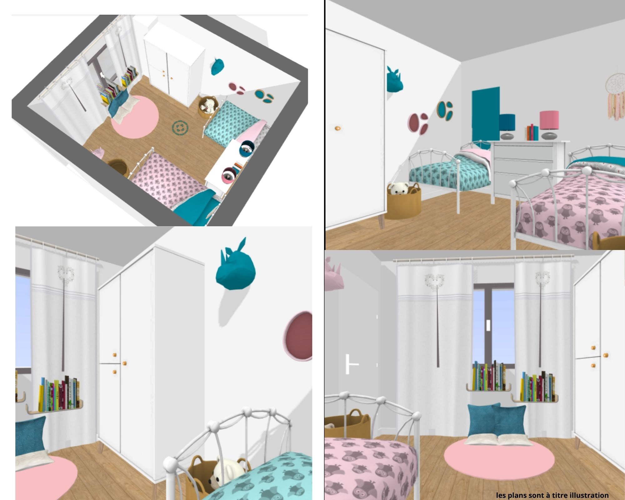 Projet de création d’une chambre d’enfants en créant deux planches inspirations avec deux aménagement complètement différents en tenant compte du fonctionnement de vie de mes clients, plan en 2D, 3D et une listes d’achat . une chambre au sous-sol sobre et lumineuse pour deux petites filles avec un espace de couchage, un espace de lecture et un espace pour ranger les vêtements